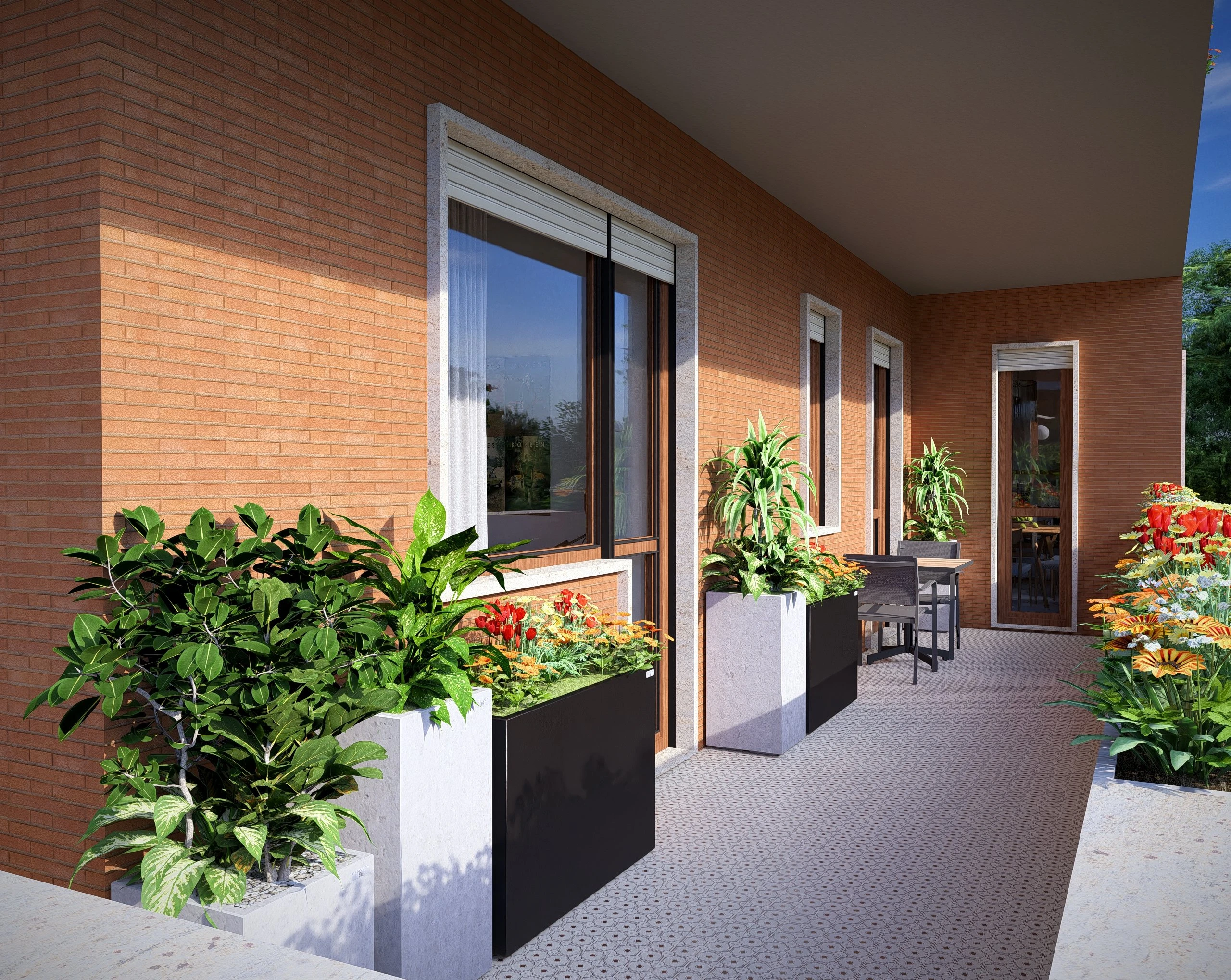 Linee pulite, volumi regolari e grandi balconi creano un ritmo armonioso, mentre la cortina in mattoni dona calore e personalità.